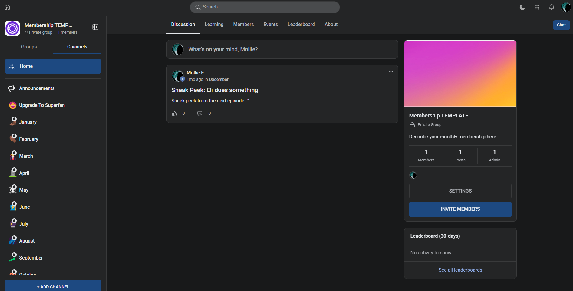 The way this template is set up, new members joining your community will get access to the current month’s content/community so members can discuss, comment, post, and engage with each other around that topic